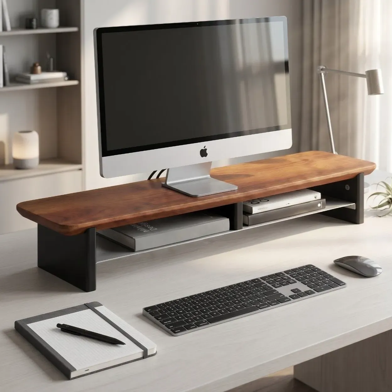 Elevate your workspace with this premium Monitor Riser crafted from durable wood and strong steel. Designed to improve screen height for better posture, it features a spacious top surface and a convenient lower shelf for storing books, notes, keyboards, and desk essentials. A stylish and practical solution for an organized workspace.